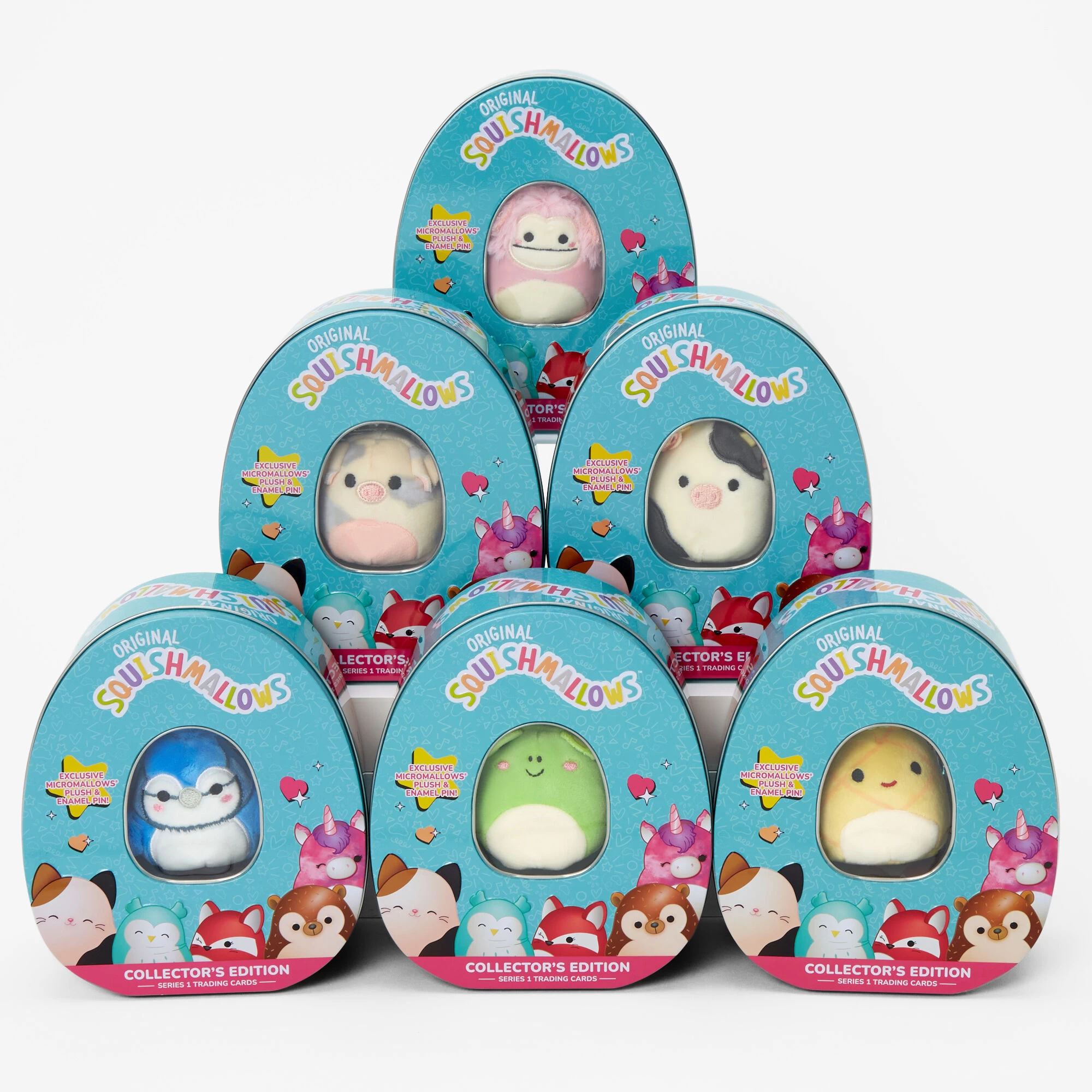 Collect them all! In this case, you can. Within this Squishmallows™ Series 1 trading card tin, you’ll receive 7 mystery trading cards, perfect for trading & collecting with friends, a mini plush toy, and matching pin! Find a Founder Redemption Card and win an exclusive Squishmallows™ plush!