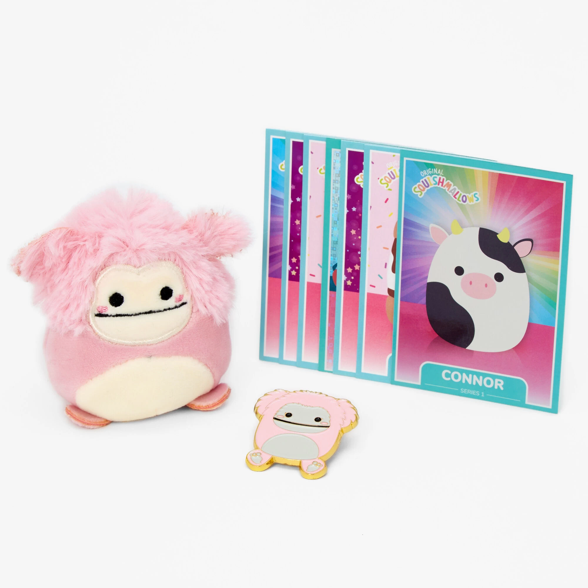 - Included: 7 trading cards*, mini plush toy, pin